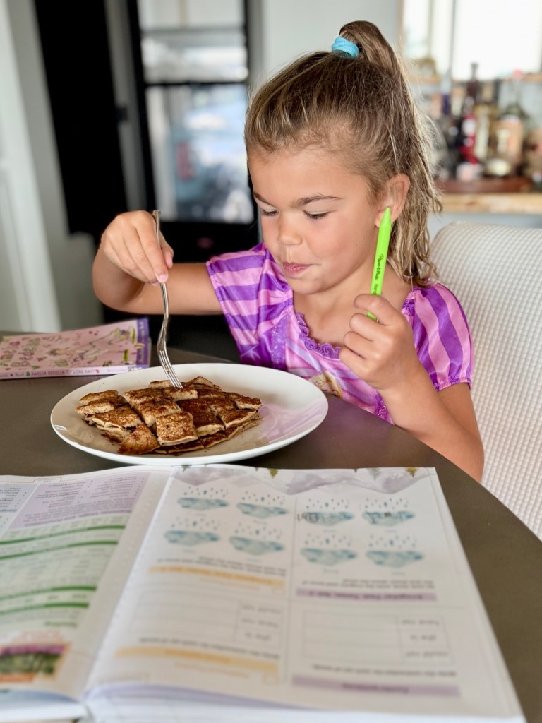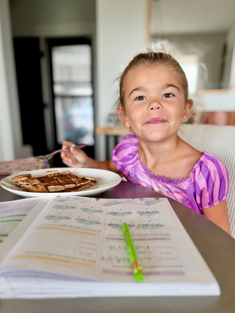 We’ve made unit assessments something Lucy actually looks forward to—because on “test days,” we have pancake quizzes! Every correct answer earns a bite of pancake. It’s lighthearted and silly, but it works. It turns a potentially stress-filled moment into one of giggles, syrup, and celebration. And of course—yes, she gets the pancakes either way! The bites are just a sweet (literal) reward for effort and courage.