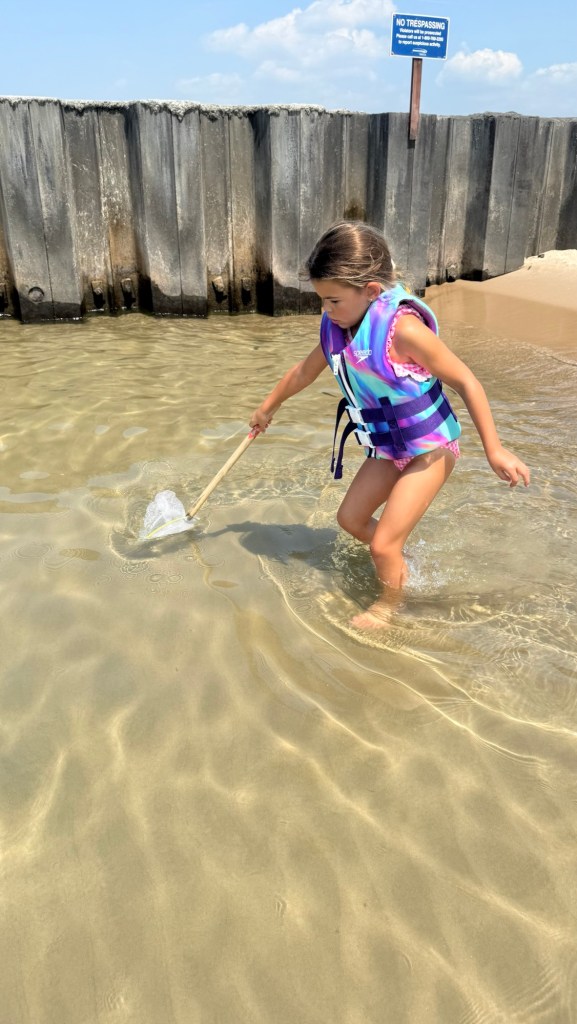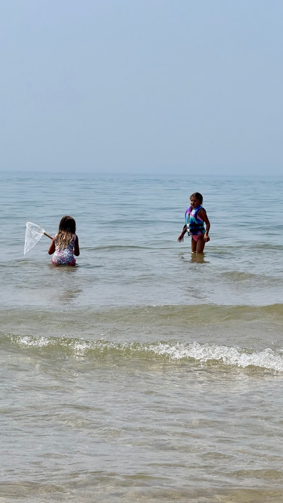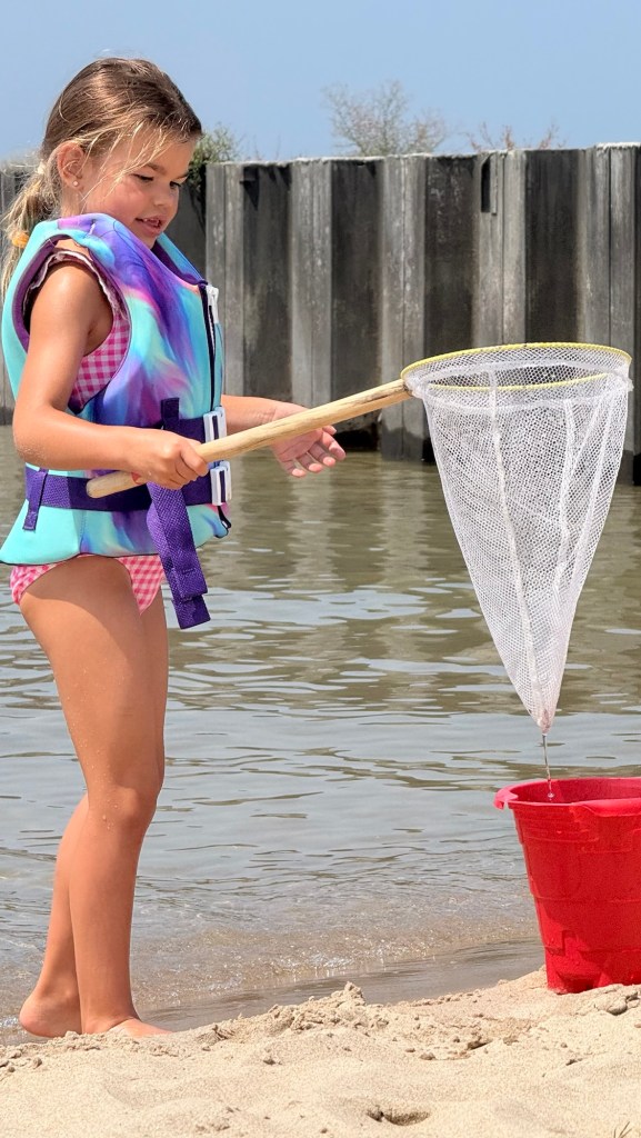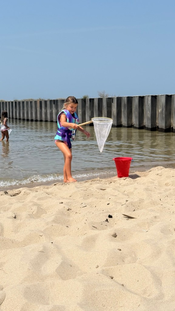 We spent the afternoon with friends, and it was everything I didn’t know I needed. I had some much-needed grown-up conversation with another parent (the kind that fills your cup), while the kids built castles, caught minnows, and turned splash fights into Olympic events. Anderson was the reigning champion of beach battles, while Lucy and her friend worked together like professional minnow wranglers.