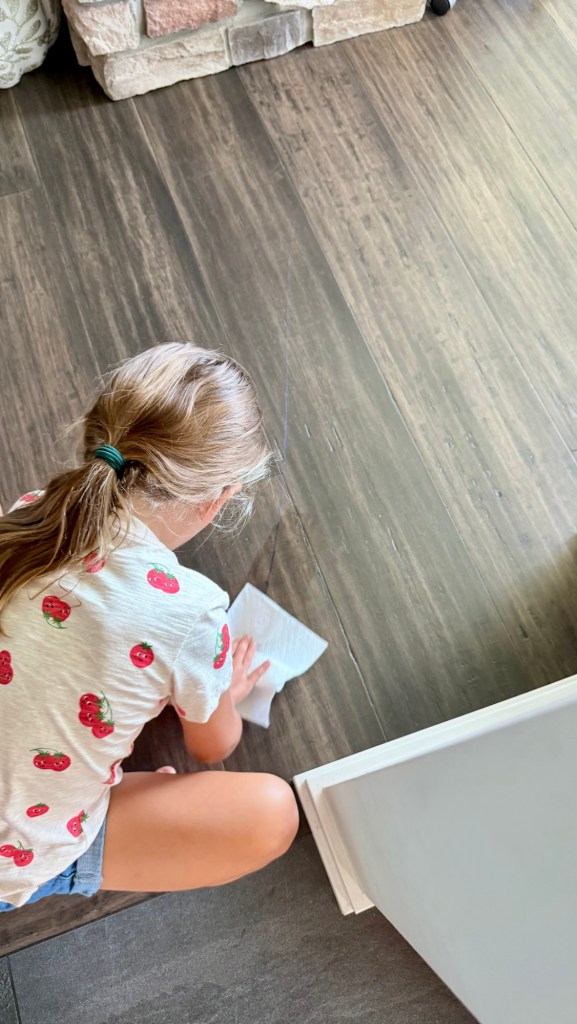 The other day while I was on the phone, I noticed Lucy crouched down, scrubbing the floor with such determination. Turns out, while I was vacuuming, a little piece of a purple colored pencil got caught and left a big streak across the floor. Without anyone telling her to, Lucy immediately got to work.