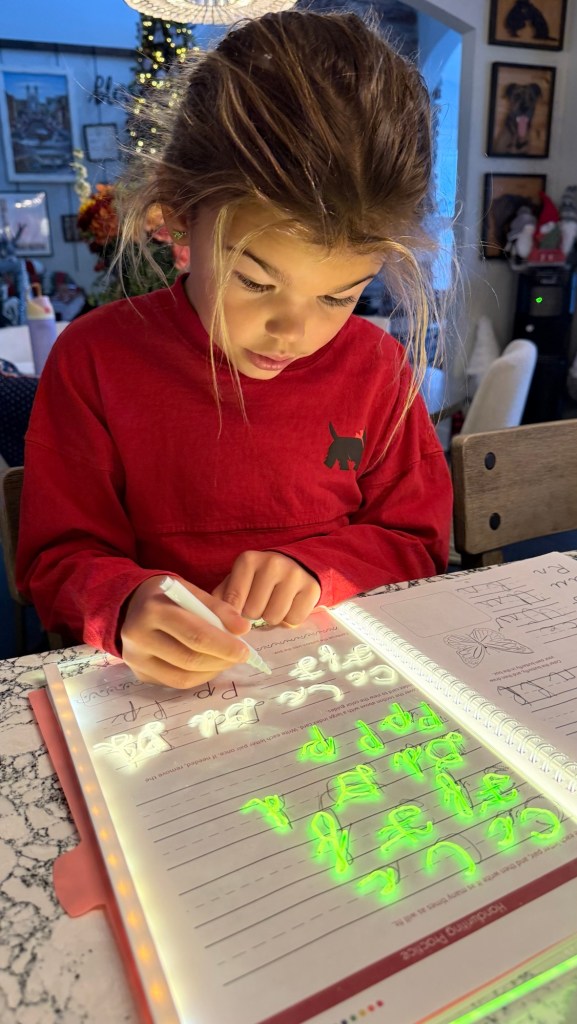 Lucy grinning as her neon letters glow across the page Her intense little concentration face The proud smile when she nails a math step The bright colors, the excitement, the sparkle in her eyes